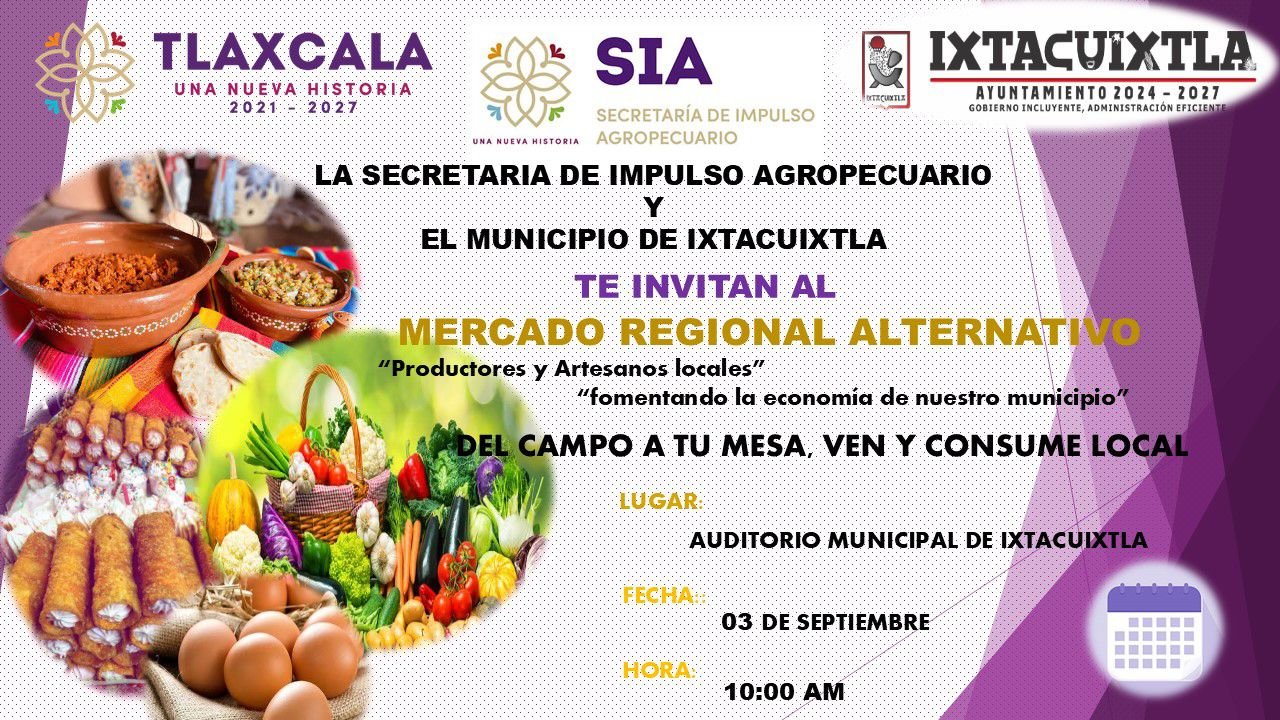 Tlaxcala, Tlax, a 27 de agosto de 2025/Redacción/ El gobierno municipal de Ixtacuixtla que encabeza el alcalde Alberto Hernández Olivares, en coordinación con la Secretaría de Impulso Agropecuario SIA, invita a todas las familias del municipio a participar en el Mercado Regional Alternativo “Del campo a tu mesa”, que se llevará a cabo en el auditorio municipal este 3 de septiembre del año en curso a las 10:00 de la mañana.