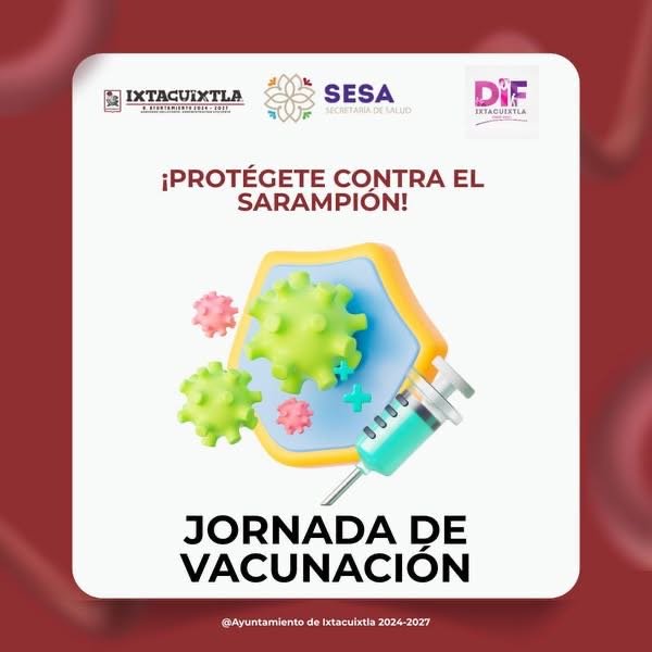 Tlaxcala, Tlax, a 21 de julio de 2025/Redacción/ El gobierno municipal de Ixtacuixtla, encabeza el Alberto Hernández Olivares, en coordinación con la Secretaría de Salud del Estado de Tlaxcala SESA, así como el Sistema Municipal para el Desarrollo Integral de la familia SMDIF y la Coordinación de Salud Municipal, informa a la ciudadanía que, ante la alerta epidemiológica por sarampión, se llevará a cabo una Campaña Intensiva de Vacunación mediante brigadas casa por casa, con el objetivo de proteger a la población y prevenir contagios.