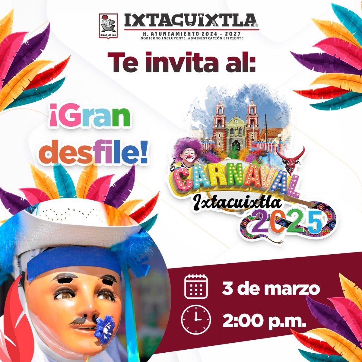 El Ayuntamiento de Ixtacuixtla 2024-2027, en colaboración con la Dirección de Educación, Cultura, Deporte y Turismo, tiene el honor de invitar a toda la comunidad a unirse a nosotros mañana para celebrar la alegría, la tradición y el colorido del Carnaval #Ixtacuixtla 2025.