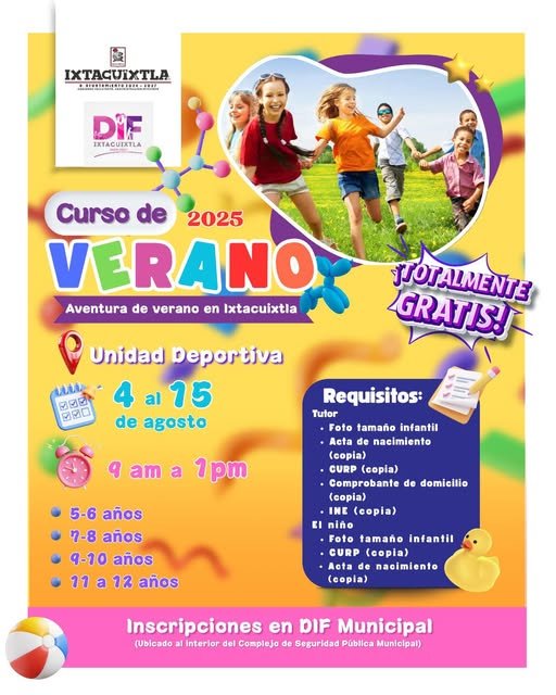 Tlaxcala, Tlax, a 22 de julio de 2025.- El gobierno municipal de Ixtacuixtla que encabeza el alcalde Alberto Hernández Olivares a través de Sistema Municipal para el Desarrollo Integral de la familia (SMDIF), que dirige María Clara Hernández Márquez, dieron a conocer el próximo “curso de verano 2025” el cual se realizará del 4 al 15 de agosto, el cual llega con grandes aventuras, juegos y diversión para niñas y niños de 5 a 12 años, en la Unidad Deportiva Municipal.