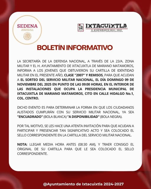 El H. Ayuntamiento de Ixtacuixtla y SEDENA informan que el Sorteo del Servicio Militar Nacional se realizará el domingo 09 de noviembre de 2025, a las 09:00 a.m., en la Presidencia Municipal.