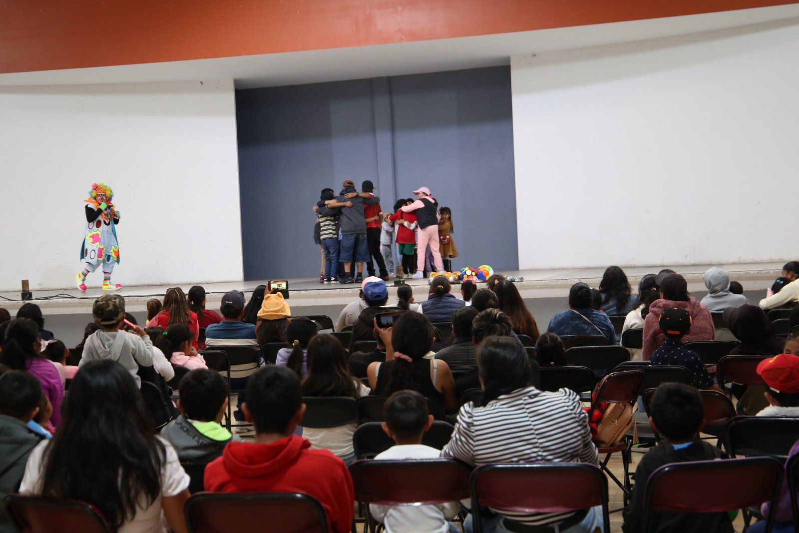 El alcalde acompañado de la sindico municipal, regidoras y regidores, fueron quienes recibieron a los cientos de niñas y niños que se dieron cita en el auditorio municipal quienes les entregaban un bonito juguete además de unas palomitas y un refresco para que disfrutaron del Show de payasos.