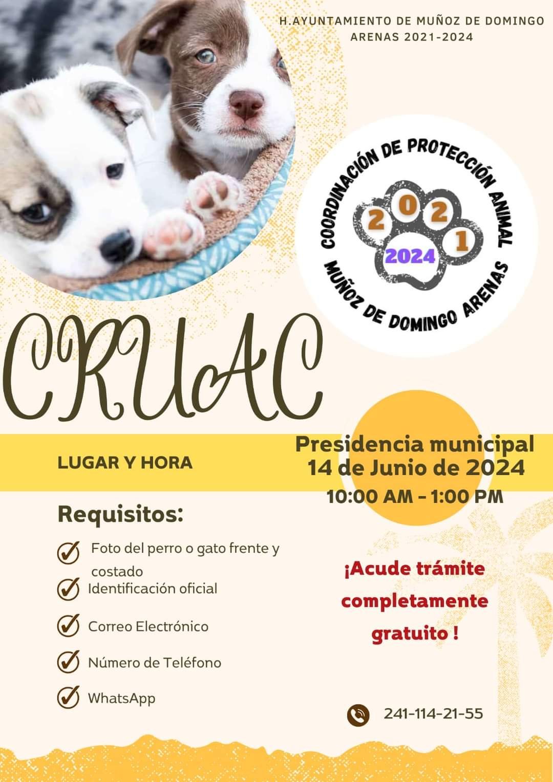 Tlaxcala, Tlax, a 11 de junio de 2024/Redacción/ El gobierno municipal de Muñoz de Domingo Arenas, a través de la Coordinación de Protección Animal del municipio, invitan a todos los ciudadanos de las diferentes comunidades y de la cabecera municipal a registrar sus mascotas ya sea perro y gato y será este 14 de junio del año en curso y dicho registro será gratis.