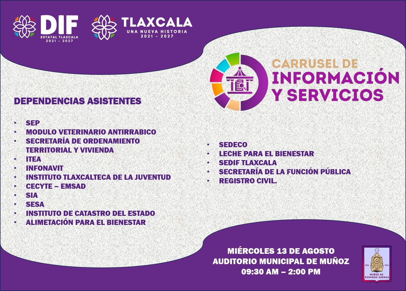 Tlaxcala, Tlax, a 12 de agosto de 2025/Redacción/ el gobierno municipal de Muñoz de Domingo Arenas que encabeza el alcalde Héctor Prisco Fernández, dio a conocer a través de su pagina oficial y del portal digital NT Noticias Tlaxcala, que este 13 de agosto del año en curso llegara a la cabecera municipal el “Carrusel de Información y Servicios”, donde los ciudadanos tendrán acceso a varias dependencias del gobierno del estado sin que tengan que trasladarse a la capital del estado.