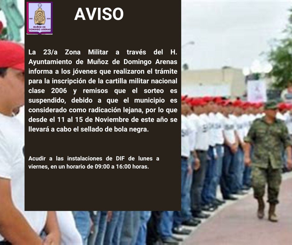 Tlaxcala, Tlax, a 10 de noviembre de 2024/Redacción/ El gobierno municipal de Muñoz de Domingo Arenas que encabeza el alcalde Héctor Prisco Fernández, así como la Junta Municipal de Reclutamiento y la Secretaria de la defensa Nacional dieron a conocer el siguiente “AVISO”, a los jóvenes que realizaron el tramite para inscripción de la “Cartilla Militar Nacional” clase 2006 y remisos que el sorteo es SUSPENDIDO, debido que el municipio es considerado como radicación lejana, por lo que desde el 11 al 15 del presente mes se llevará a cabo el “sellado de bola negra”.