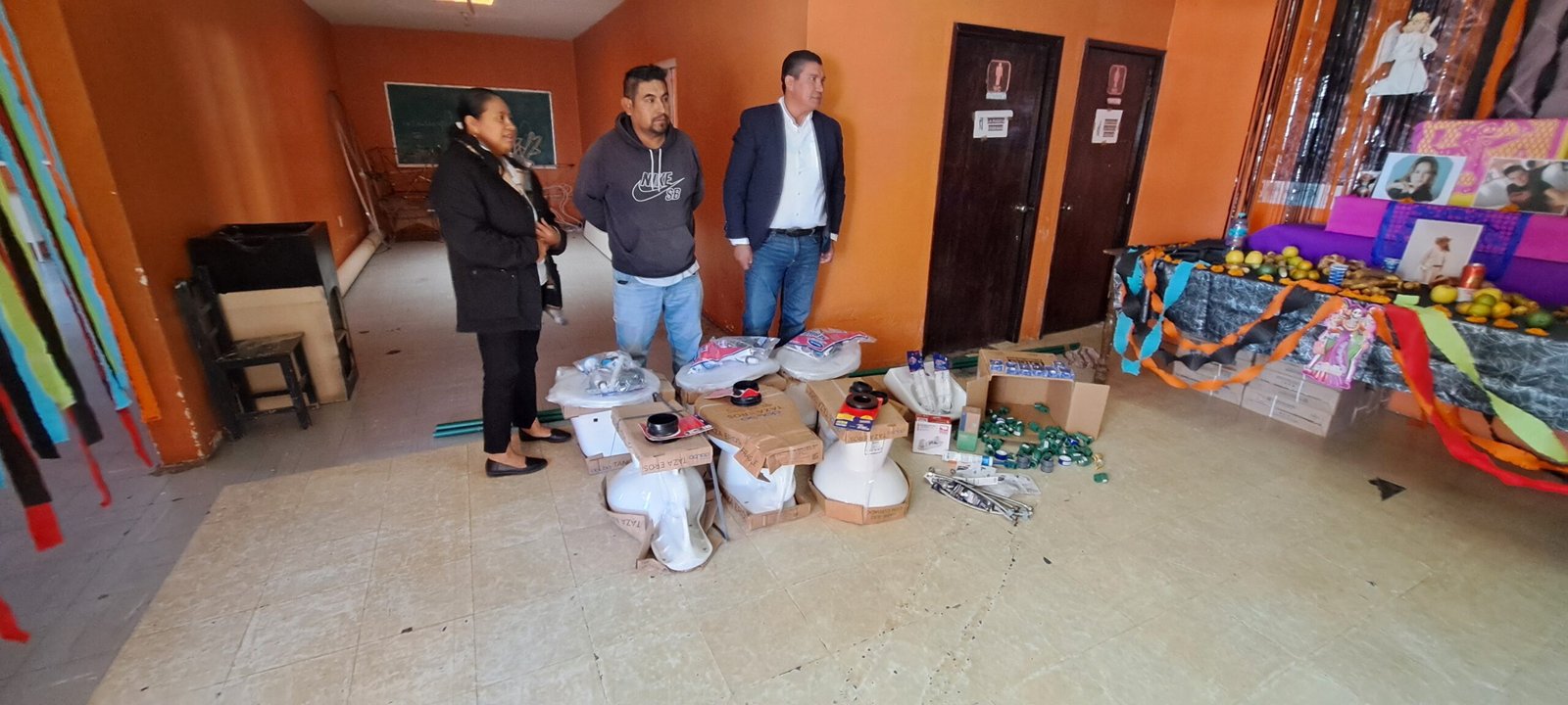 El alcalde durante la entrega de los accesorios y el material estuvo acompañado de la síndico, el regidor y el presidente de dicha comunidad, a quienes les señalo que es de suma importancia contar con el área de baños en buen estado.