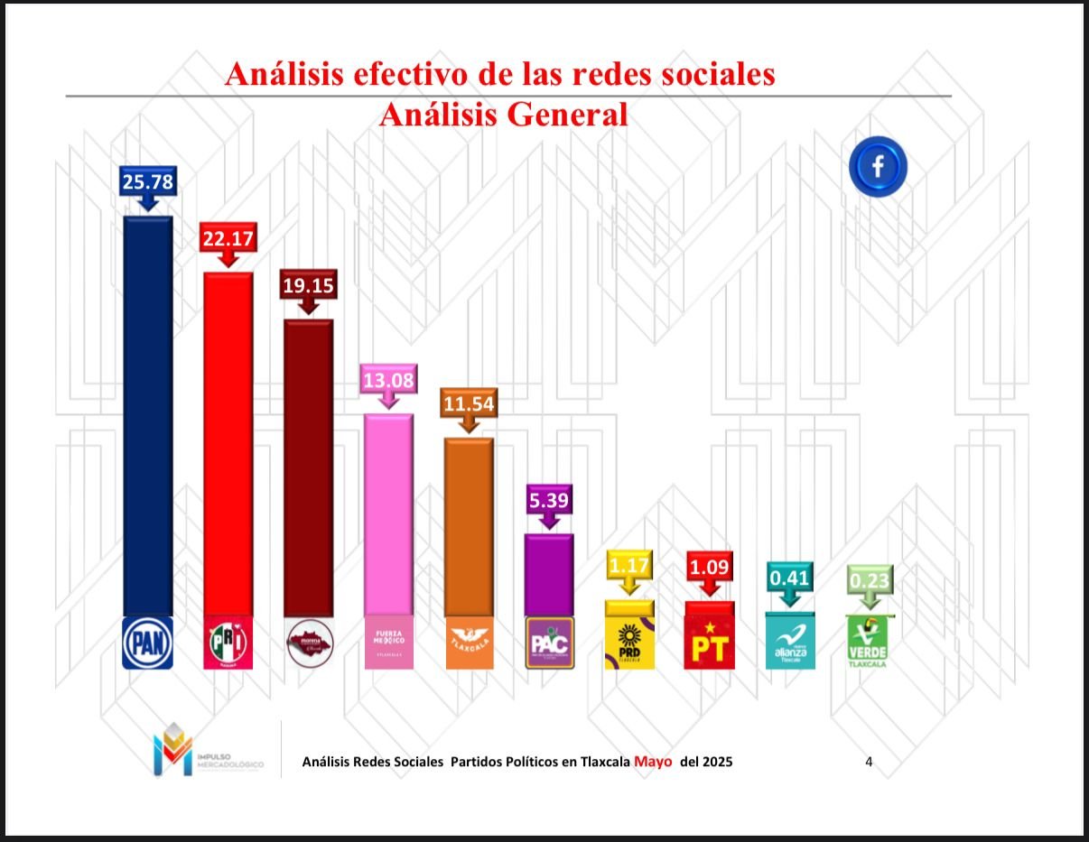 De acuerdo con el trabajo realizado por la firma Impulso Mercadológico, denominado Análisis digitales de las redes sociales oficiales de los partidos políticos en la entidad, la de Acción Nacional mantiene un repunte y encabeza las mediciones en rubros como visbilidad, participación y reacciones.