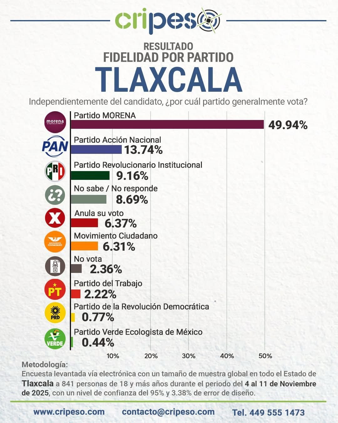 Este avance en las preferencias refleja la consolidación del partido como el vehículo preferido por los tlaxcaltecas que buscan una opción distinta. Los datos de Cripeso marcan una tendencia favorable para Acción Nacional y confirman su crecimiento como el referente opositor más fuerte en la entidad.