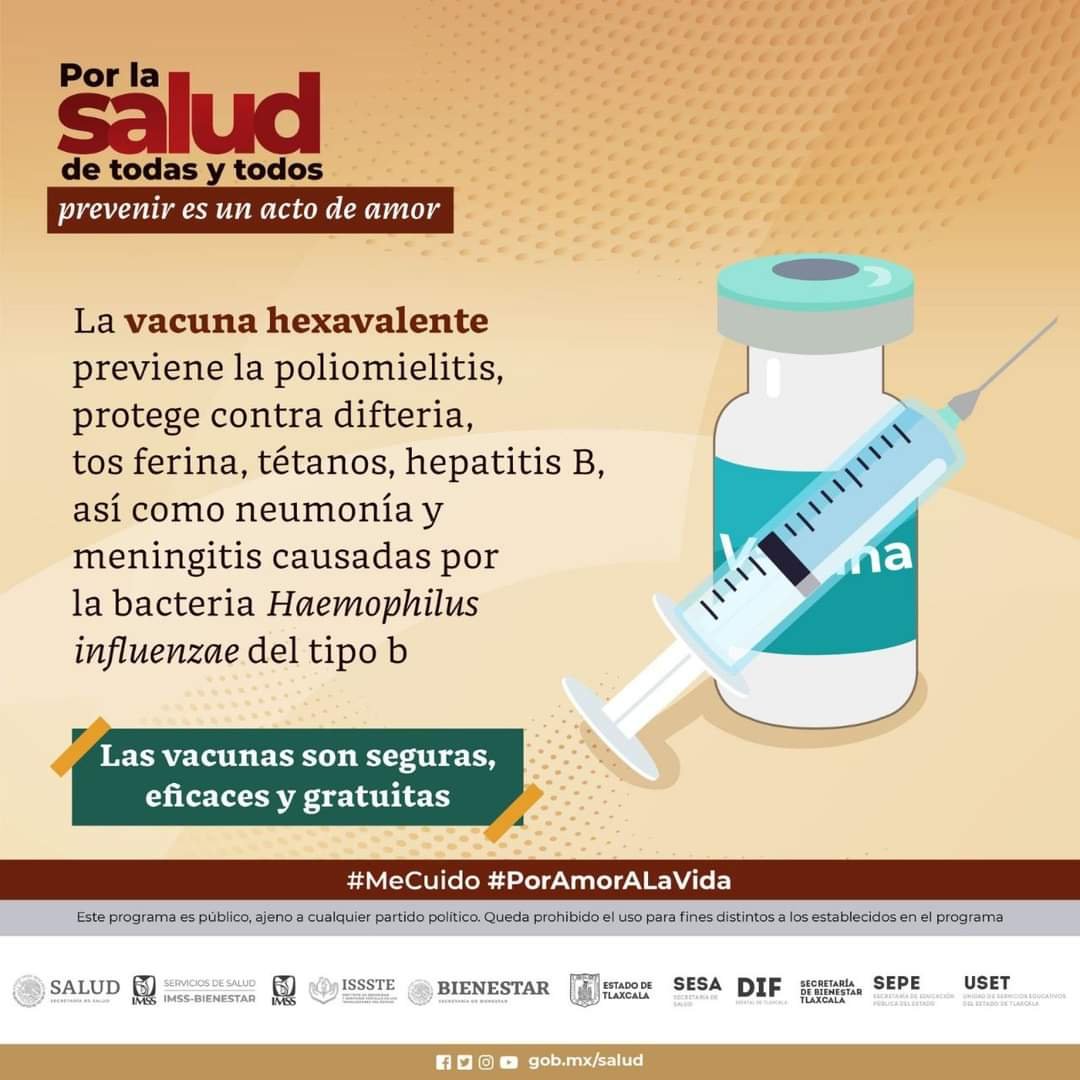 La vacuna Hexavalente previene la poliomielitis, protege contra la difteria, tos ferina, tétanos, hepatitis B, además la neumonía y meningitis causadas por la bacteria Haemophilus influenzae del tipo b.