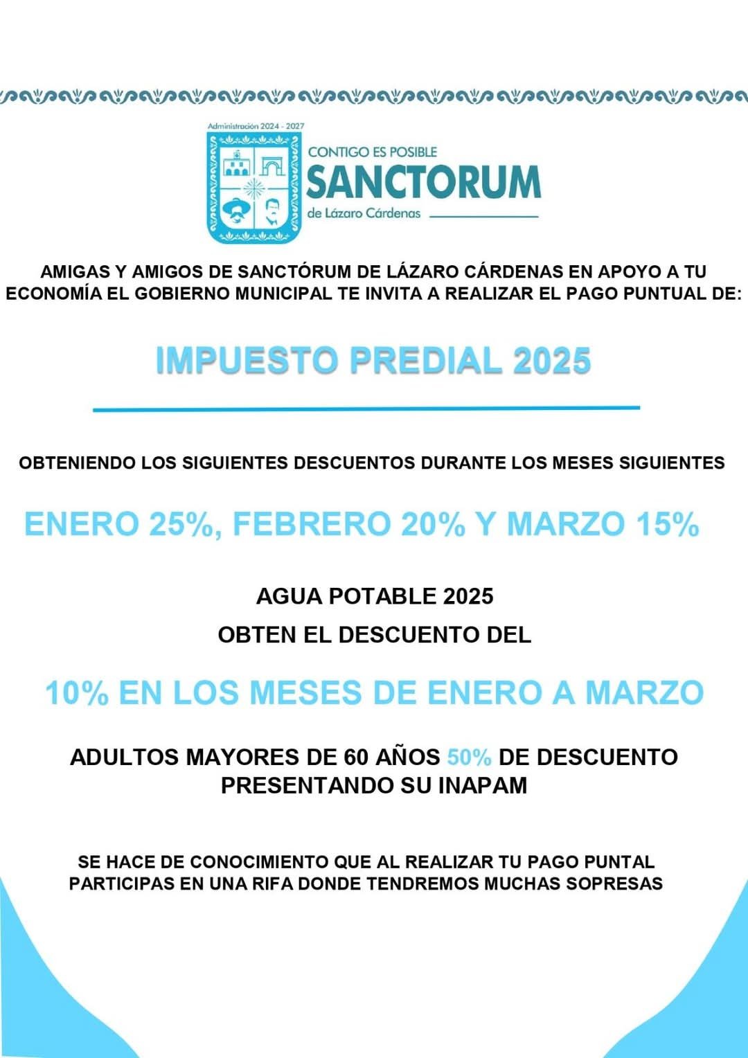 Alemán Juárez comento si el pago del “impuesto predial 2025” lo realizas en enero tendrás un descuento del 25 por ciento, si lo realizas en febrero el descuento será del 20 por ciento y si lo realizas en marzo tu descuento será del 15 por ciento, subrayo.