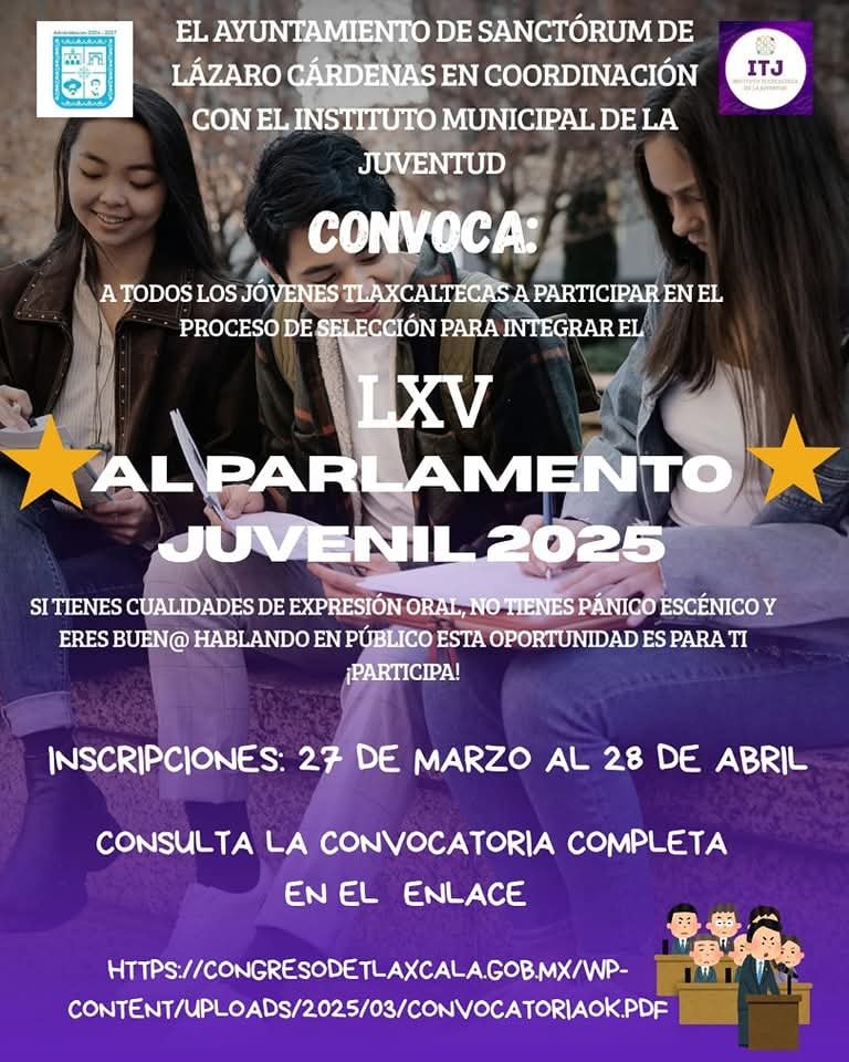 Tlaxcala, Tlax, a 4 de abril de 2025/Redacción/ El gobierno municipal de Sanctórum de Lázaro Cárdenas que encabeza el alcalde Iván Alejandro Alemán Juárez, en coordinación con el Instituto Municipal de la Juventud, dieron a conocer a través de su pagina oficial y del periódico digital HN Noticias Tlaxcala la convocatoria a los jóvenes del municipio a que participen en el proceso de selección para integrarse al “LXV Parlamento Juvenil 2025”.