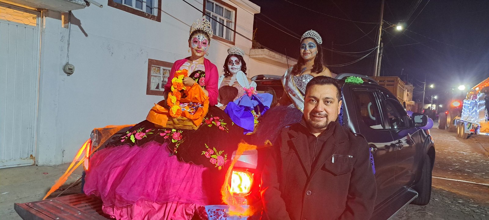 La catrina llego al palacio con un vestido de terciopelo buscando al buen presidente que manda con mucho anhelo, Iván Alejandro muy elegante con su traje bien planchado le ofreció café y pan de dulce y hasta un mole bien preparado.