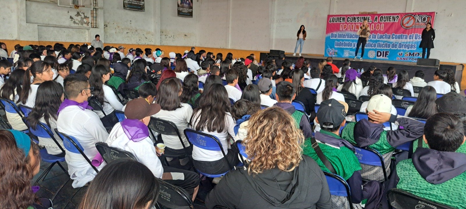 Tlaxcala, Tlax, a 25 de junio de 2025 En el marco del Día Internacional de la Lucha Contra el Uso Indebido y el Trafico Ilícito de Drogas, el gobierno municipal de Sanctórum de Lázaro Cárdenas que encabeza el alcalde Iván Alejandro Alemán Juárez en coordinación con el Sistema Municipal para el Desarrollo Integral de la Familia (SMDIF) que dirige la directora Jaqueline Larios Castillo, llevaron a cabo un evento denominado “Quien Consume, a Quien” donde alumnos de CECyTE 04 y de la Telesecundaria José Joaquín Fernández de Lizardi participaron en una caminata y en una conferencia magistral.