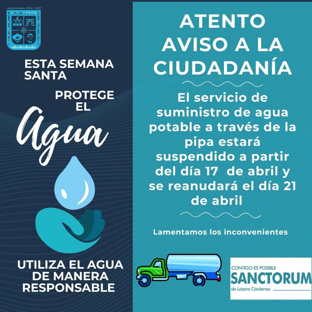 Tlaxcala, Tlax, a 14 de abril de 2025/Redacción/ El gobierno municipal de Sanctórum de Lázaro Cárdenas, informo a la ciudadanía que el servicio de suministro de agua potable a través de la pipa estará suspendido a partir del día 17 de abril y se reanudará el día 21 de abril, es importante mencionar que el suministro por la red seguirá operando con normalidad.