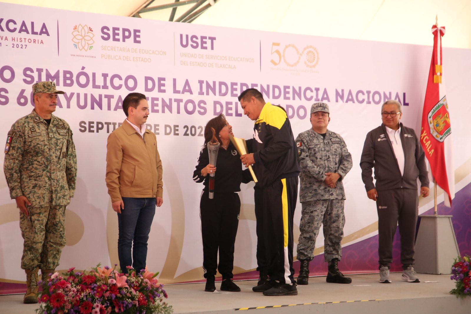 Tlaxcala, Tlax, a 15 de septiembre de 2025/Redacción/ En el marco del CCXV Aniversario de la Independencia de México, el gobierno municipal de Santa Apolonia Teacalco que encabeza el alcalde, Arturo Macuilt Díaz asistió al domo blanco de la capital del estado donde la gobernadora del estado Lorena Cuéllar Cisneros, entregó el fuego simbólico de Independencia Nacional a los 60 Ayuntamientos del estado, el cual representa la memoria de los actos heroicos durante la lucha para consolidar a México como una nación independiente.