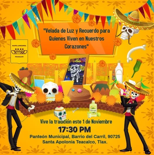 Tlaxcala, Tlax, a 30 de octubre de 2025/Redacción/ El gobierno municipal de Santa Apolonia Teacalco que encabeza el alcalde Arturo Macuilt Díaz, dio a conocer que este 1 de noviembre del año en curso se llevara a cabo la “Velada de Luz y Recuerdo para Quienes Viven en Nuestros Corazones” en el Panteón Municipal donde, compartiremos una noche de recuerdo, fe y tradición.
