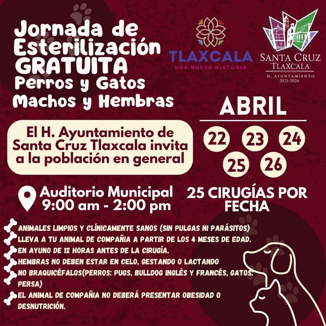 Tlaxcala, Tlax, a 15 de abril de 2024/Redacción/ El gobierno municipal de Santa Cruz Tlaxcala a cargo de Lic. Miguel Ángel Becerra Díaz y través de la coordinación Animal de la Secretaria de Salud, se llevará del 22 al 26 de abril del presente año la “jornada de Esterilización gratuita” a perros y gatos tanto machos como hembras, en su mensaje el edil señalo que es hora de hacer conciencia sobre la situación que representa la sobrepoblación de animales en las calles y esto genera problemas de salud donde nuestros niños y adultos mayores son los principales afectados.