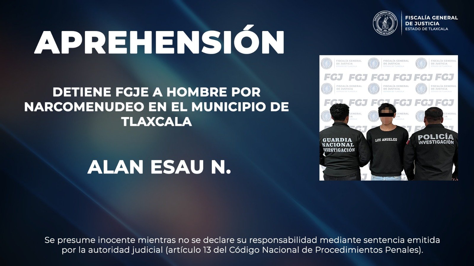 La Fiscalía General de Justicia del Estado (FGJE), a través de la Policía de Investigación, realizó la detención de Alan Esau N. por delitos contra la salud, en su modalidad de narcomenudeo.