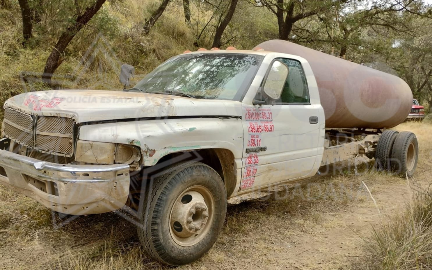 Se trata de una camioneta Chrysler RAM 3500, adherida a un tanque café con la leyenda A.C. 1439, además de una camioneta Ford F350, adjunta a un tanque blanco con la leyenda “Contenido: Gas L.P”, con capacidad de 5 mil.