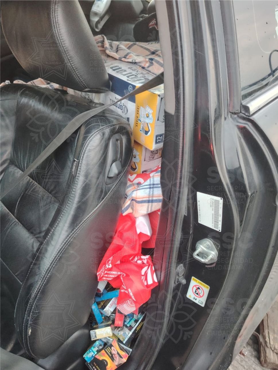 Al realizarles una inspección preventiva a su persona como al vehículo, se les encontró una réplica de arma de fuego calibre .22 así como mercancía de la cual no pudieron acreditar la legal procedencia.