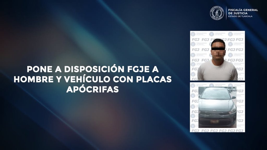 Elementos de la Policía de Investigación de la Fiscalía General de Justicia del Estado (FGJE) pusieron a disposición a Joan Edgar N., así como un vehículo marca Kia, tipo Sedán, modelo 2021, por el probable uso indebido de placas.