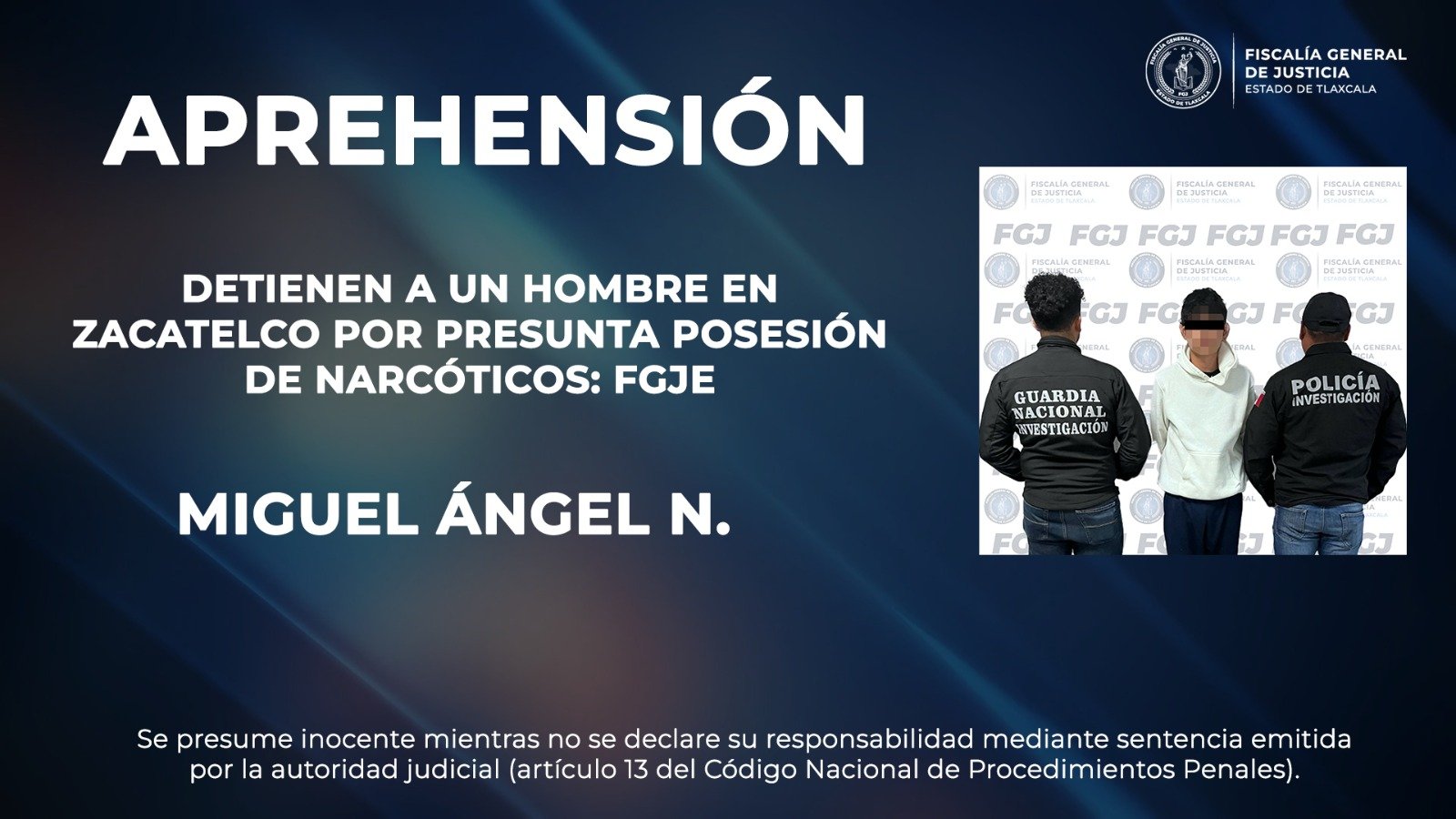 La Policía de Investigación, adscrita a la Fiscalía General de Justicia del Estado (FGJE), detuvo a Miguel Ángel N. por su probable participación en delitos contra la salud, en la modalidad de narcomenudeo.