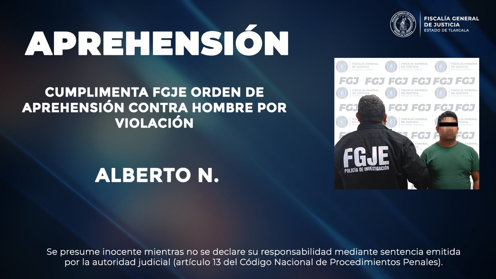 Elementos de la Policía de Investigación de la Fiscalía General de Justicia del Estado (FGJE) aprehendieron a Alberto N., por su probable responsabilidad en el delito de violación en agravio de una menor de edad.