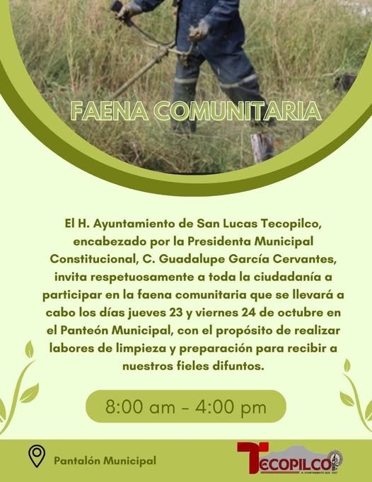 Tlaxcala, Tlax, a 22 de octubre de 2025.- En el marco de “Día de Muertos” el gobierno municipal de San Lucas Tecopilco que encabeza la alcaldesa Guadalupe García Cervantes, hacen una atenta invitación a participar en la faena comunitaria que se llevará a cabo los días jueves 23 y viernes 24 de octubre en el Panteón Municipal, con el propósito de realizar labores de limpieza y preparación para recibir a nuestros fieles difuntos.