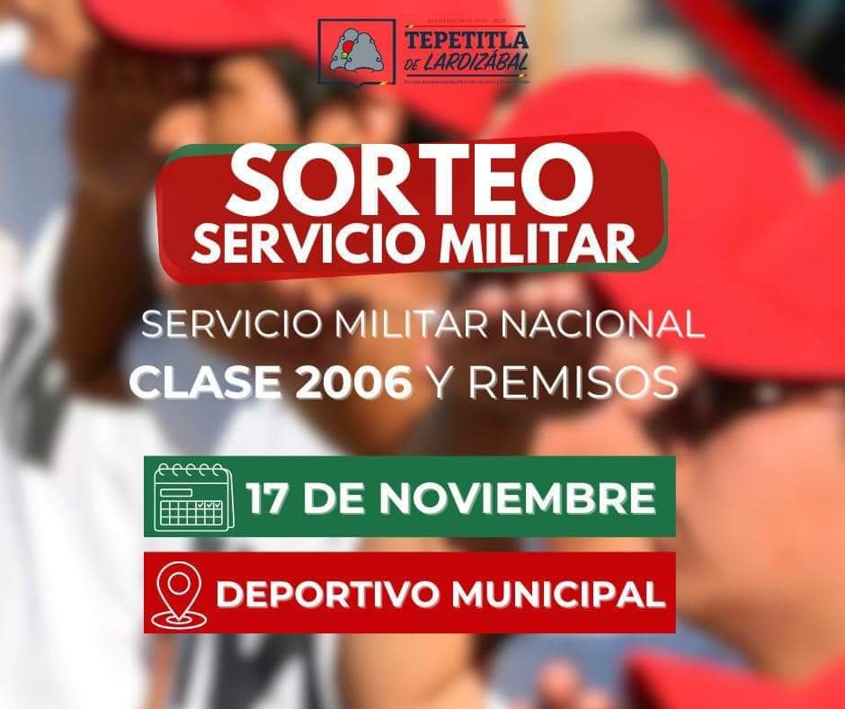 Tlaxcala, Tlax, a 11 de noviembre de 2024/Redacción/ El gobierno municipal de Tepetitla de Lardizábal que encabeza el alcalde Yoni Hernández Alvarado David Sánchez Rincón, así como la Junta Municipal de Reclutamiento y la Secretaria de la defensa Nacional dieron a conocer que el próximo domingo 17 del presente mes se llevara a cabo el sorteo del “Servicio Militar Nacional 2024 para jóvenes que tramitaron su cartilla clase 2006 y remisos, en la presidencia municipal.