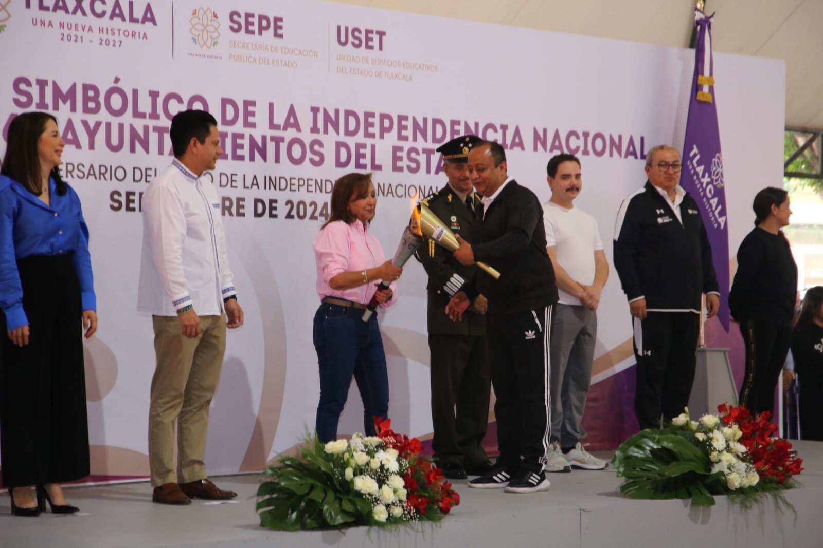 Tlaxcala, Tlax, a 15 de septiembre de 2024/JL Hertewing/ En el marco del CCXIV aniversario de la Independencia de México, el presidente municipal de San Damián Texoloc David Sánchez Rincón, acudió la mañana de este domingo 15 de septiembre al domo blanco de la capital del estado a recibir el “Fuego Simbólico de la Independencia Nacional” de manos de la gobernadora del estado Lorena Cuéllar Cisneros, en su mensaje el edil señalo que este fuego simboliza la fuerza con la que lucharon hombres y mujeres para darnos Patria Y libertad que hoy gozamos todos los mexicanos.