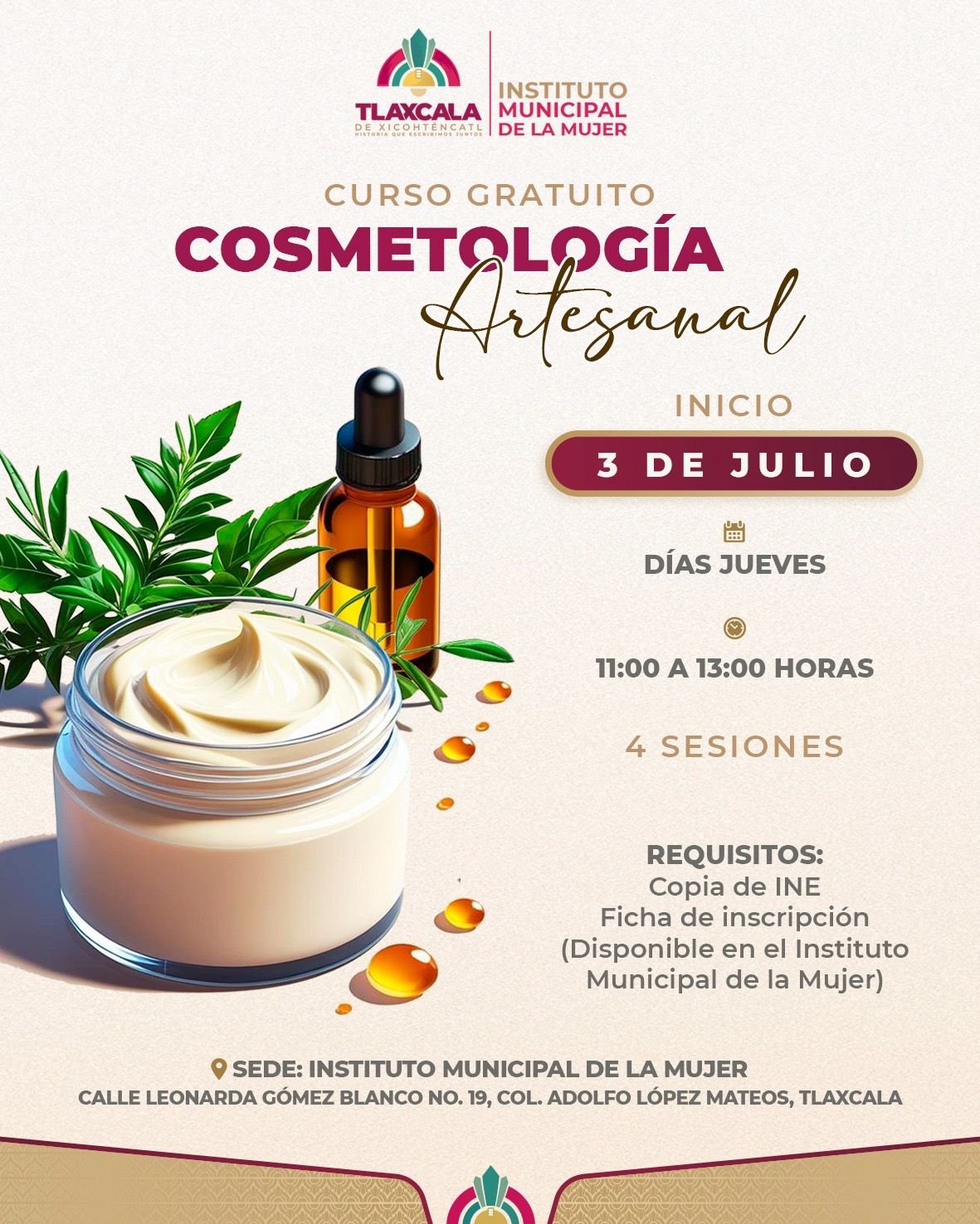 Como parte de las acciones impulsadas por el presidente municipal de Tlaxcala, Alfonso Sánchez García, para fortalecer el empoderamiento y la autonomía económica de las mujeres de la capital, el Instituto Municipal de la Mujer invita al Taller Gratuito de Cosmetología Artesanal, dirigido a todas las interesadas en aprender técnicas básicas para la elaboración de productos de belleza naturales.