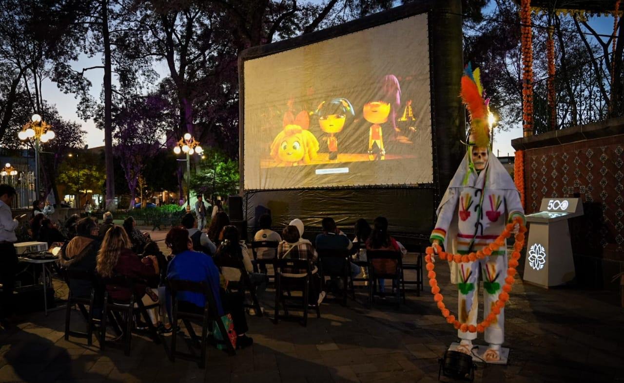 Posteriormente, la Plaza de la Constitución se transformó en una sala de cine al aire libre con la proyección de la película “El Libro de la Vida”, que reunió a familias completas en un ambiente de unión y respeto por las tradiciones.