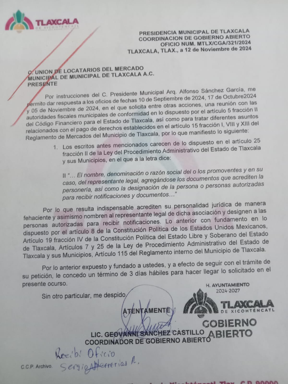 Lo anterior, luego de que una veintena de comerciantes se manifestaran, encabezados por Antonio Mendieta, quien dijo ser su líder, y enfatizó el funcionario municipal que las indicaciones del presidente municipal, con base en la Ley Municipal del Estado de Tlaxcala y el Reglamento Interno del Municipio, es que las peticiones se atiendan en tiempo y forma, tal y como se hizo ante los tres oficios emitidos por los quejosos, quienes recibieron repuesta a sus peticiones el pasado 12 de noviembre a través del Oficio Núm. MTLX/CGA/321/2024
