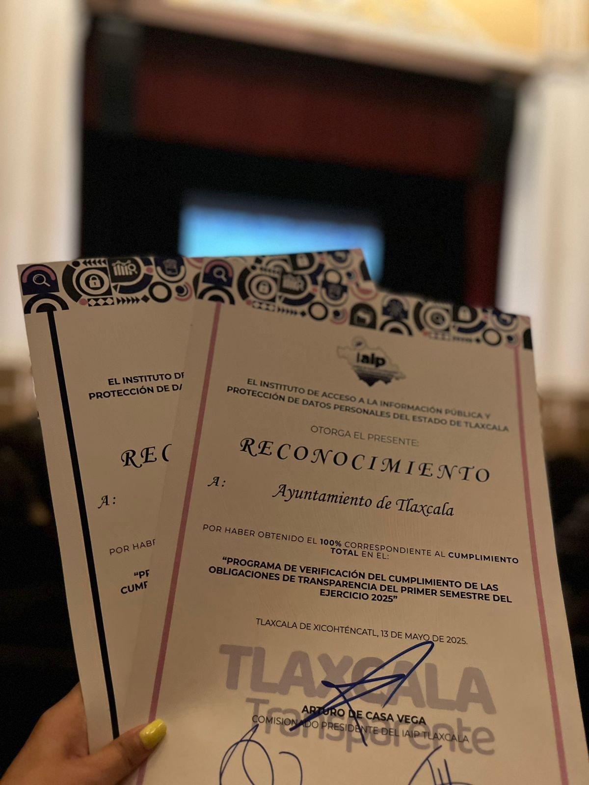 Durante la “Entrega de Reconocimientos a los Sujetos Obligados del Ejercicio 2025”, el IAIP otorgó dos distinciones al Ayuntamiento de Tlaxcala, destacando el cumplimiento total en los rubros de obligaciones de transparencia y la verificación del cumplimiento de los avisos de privacidad, logros que reflejan el trabajo constante en beneficio de la ciudadanía y el respeto a sus derechos fundamentales.