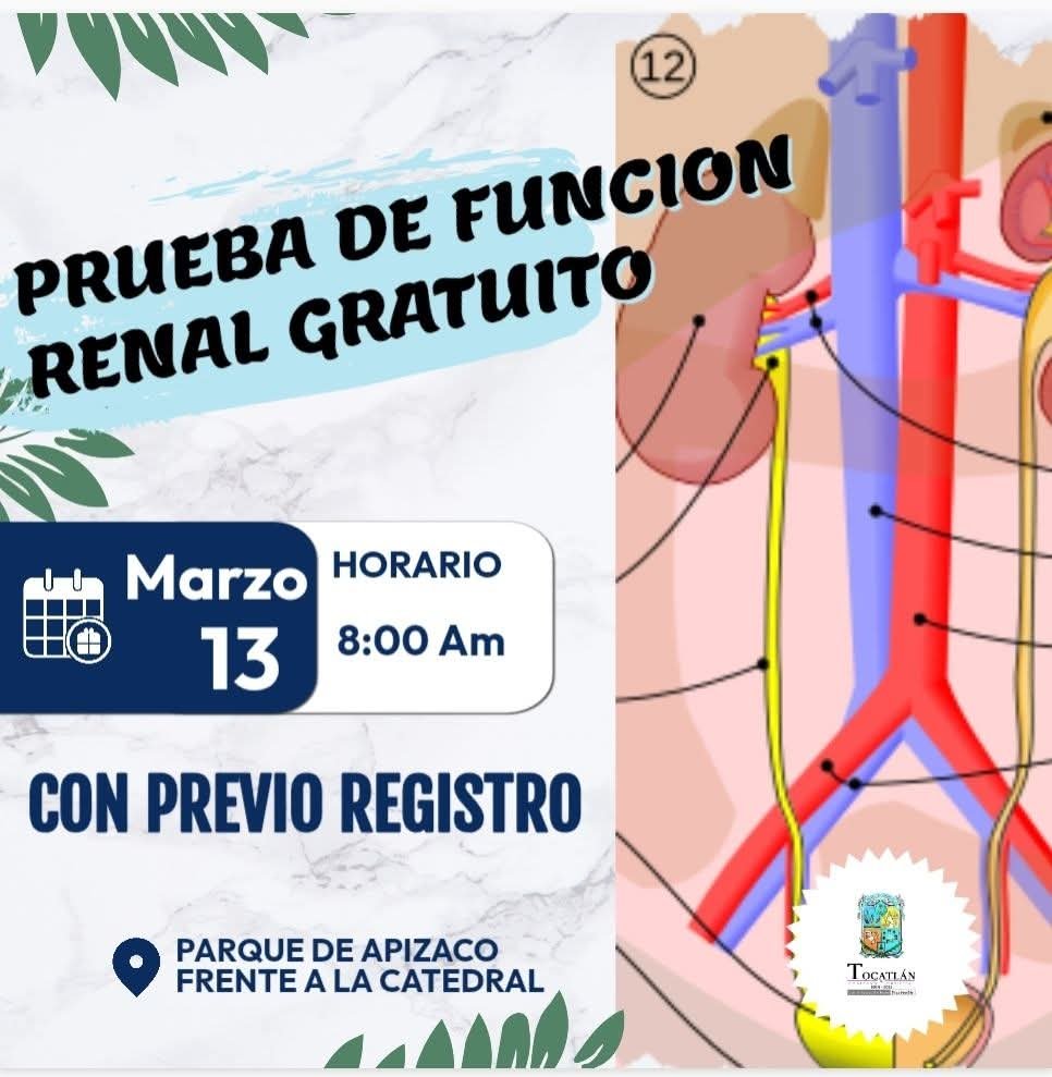 El próximo 13 de marzo de 2025, el Parque de Apizaco, frente a la Catedral, será el escenario de una importante Jornada de Salud Renal en conmemoración del Día Mundial del Riñón. Durante este evento, se realizarán 500 pruebas gratuitas de función renal, además de ofrecerse información y orientación sobre el cuidado de los riñones.