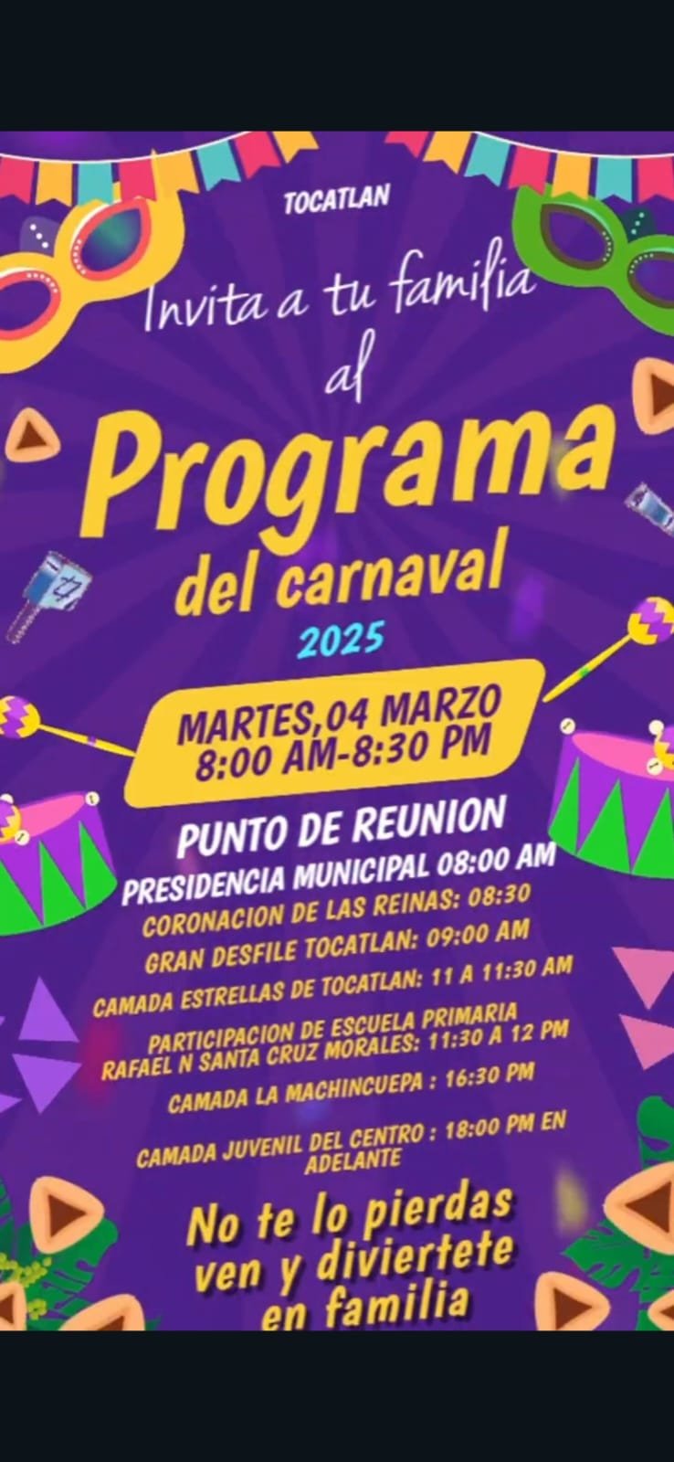 Finalizo diciendo te invitamos a ti y a tu familia este 4 de marzo a que disfrutes y vivas uno de los mejores carnavales de la región el de Tocatlán 2025, concluyo Avendaño Pérez.