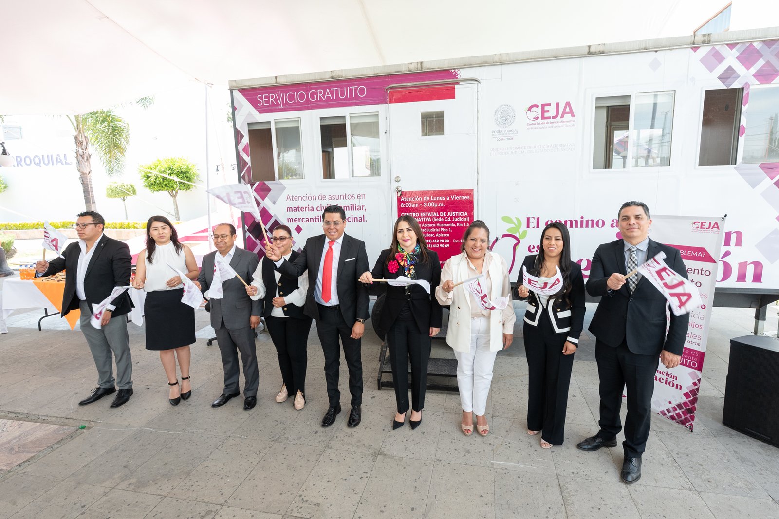 La presidenta del Poder Judicial de Tlaxcala, Anel Bañuelos Meneses y el alcalde de San Juan Huactzinco, Eberth Jhon Robles Ocotzi, dieron el banderazo de inicio de actividades de la Unidad Móvil del Centro Estatal de Justicia Alternativa (CEJA), la cual, brindará la oportunidad de acceder a los servicios en materia civil, familiar, mercantil, vecinal y penal, logrando que la justicia llegue a todas las personas que no han podido resolverlos.