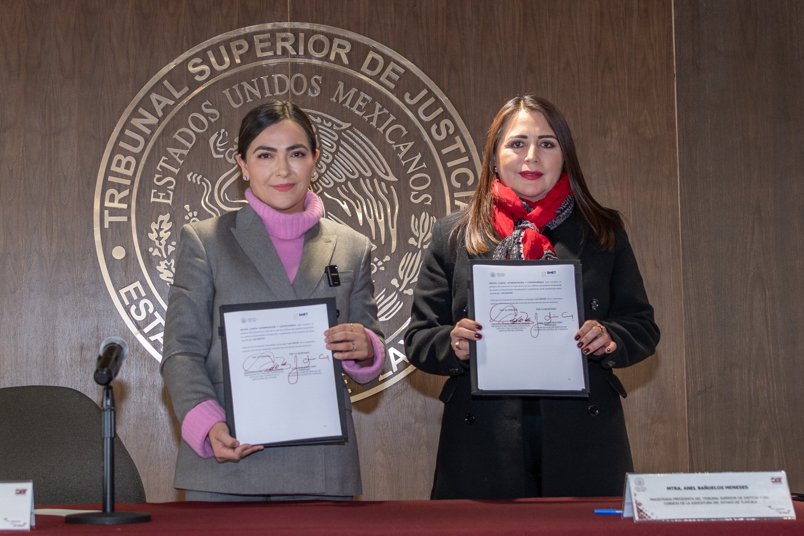 La presidenta del Tribunal Superior de Justicia y del Consejo de la Judicatura del Estado (TSJE-CJE) y la titular de la Secretaría de las Mujeres del Estado de Tlaxcala (SMET), Anel Bañuelos Meneses y Alma Nydia Cano Rodríguez, respectivamente, firmaron este día un convenio de colaboración encaminado a impulsar de manera conjunta estrategias que garanticen la igualdad de género, el respeto, protección y difusión de los derechos humanos en la impartición de justicia.