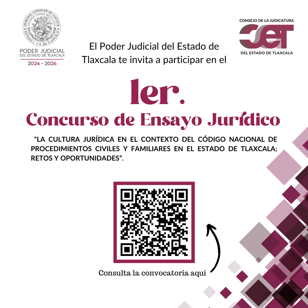 Con el objetivo de fomentar la reflexión crítica y el análisis profundo sobre temas jurídicos actuales, el Tribunal Superior de Justicia y el Consejo de la Judicatura del Estado (TSJE-CJE) lanzaron una convocatoria dirigida a abogadas, abogados y estudiantes de Derecho para participar en la elaboración de un ensayo jurídico con el tema “La Cultura Jurídica en el contexto del Código Nacional de Procedimientos Civiles y Familiares en el Estado de Tlaxcala; Retos y Oportunidades”.