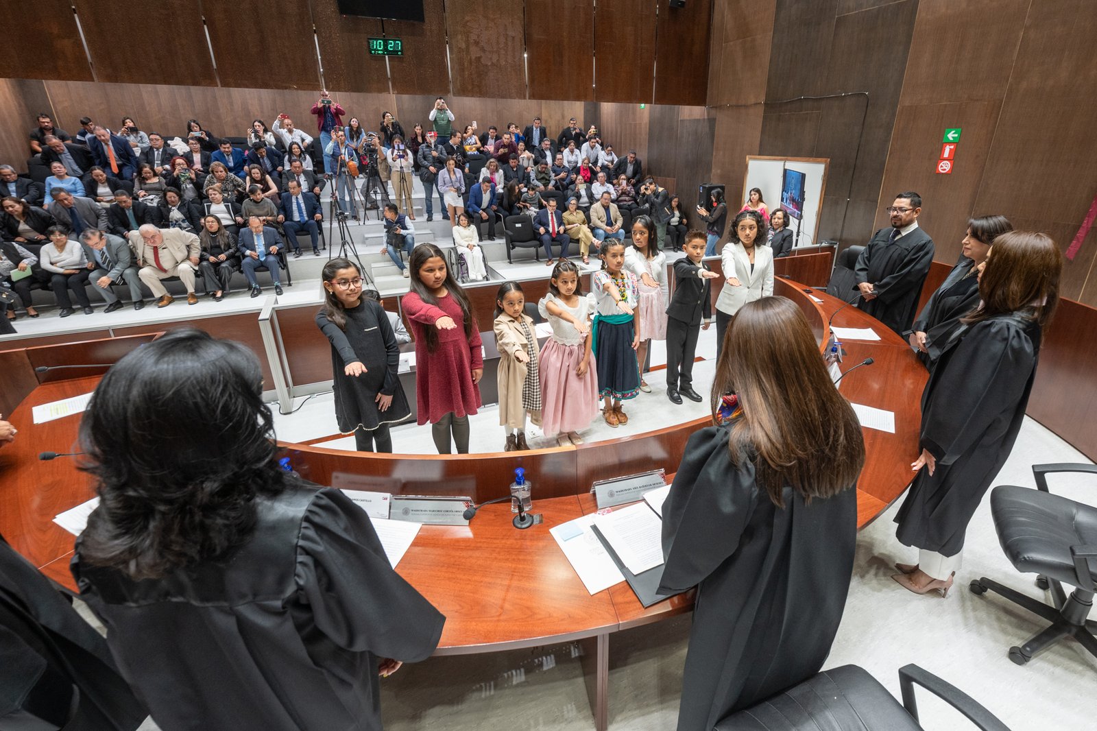 Al respecto, la presidenta del Poder Judicial de Tlaxcala, Anel Bañuelos Meneses, celebró la participación activa de niñas y niños de todo el estado, quienes, al convertirse en Magistradas y Magistrados Infantiles por un día, no solo nos comparten sus ideas, sino también enseñan otra forma de ver el mundo, con más amor, empatía y comprensión, pues recuerdan que la justicia no solo se aplica cuando hay problemas o conflictos, sino la justicia también es brindar oportunidades, abrir caminos y garantizar condiciones para que cada niña y cada niño pueda crecer con dignidad, seguridad y esperanza.