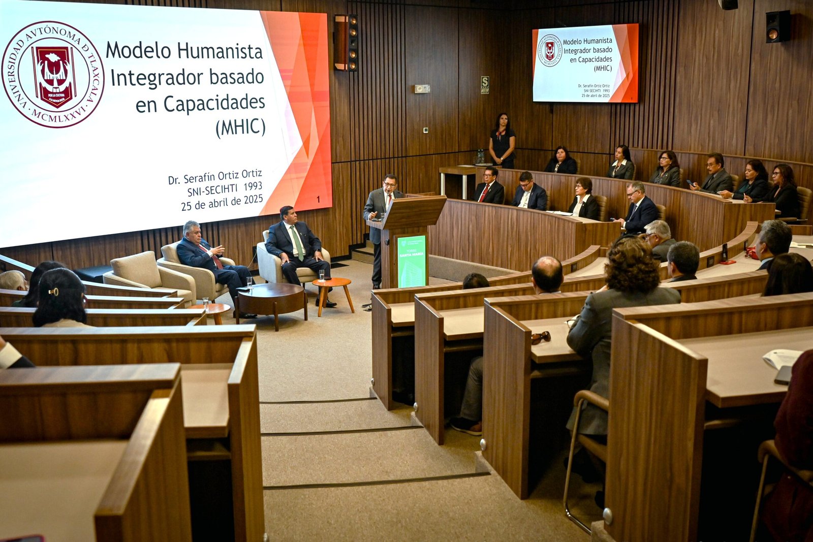 El Doctor Serafín Ortiz Ortiz, Rector de la UATx, presentó en el Aula Magna de la Torre Santa María de la Universidad Católica de Santa María (UCSM) de Arequipa, Perú, el Modelo Humanista Integrador Basado en Capacidades (MHIC) que impulsa una formación integral, con enfoque humanista, innovador y un alto compromiso social, implementado de forma exitosa en esta Casa de Estudios desde hace dos décadas, y que fue considera en la UCSM como una valiosa propuesta para fortalecer la educación superior en América Latina.