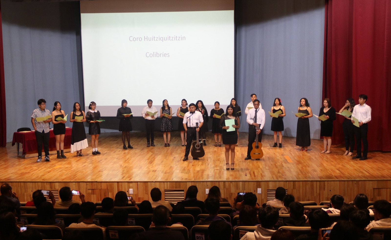 El Doctor Nava Nava ofreció una conferencia dinámica e interactiva que permitió a las y los estudiantes el aprendizaje de palabras, canciones y poemas en Náhuatl con la actuación del coro en lengua náhuatl Huitziquitzitzin (Colibríes) de la Facultad Filosofía y Letras.