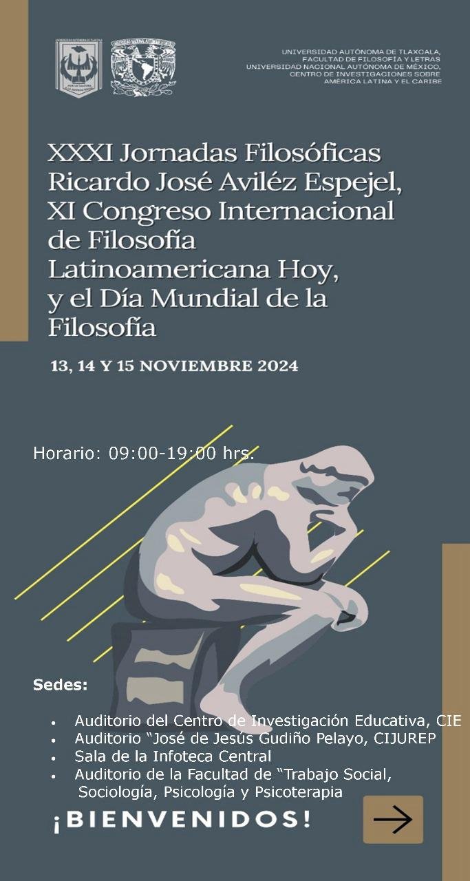 En una labor permanente a lo largo de 37 años para proyectar la importancia de la filosofía y fortalecer la formación de los estudiantes en este campo disciplinar, la Facultad de Filosofía y Letras de la Universidad Autónoma de Tlaxcala (UATx) celebrará las XXXI Jornadas Filosóficas “Ricardo José Avilez Espejel”, bajo el tema “Filosofía y responsabilidad social”, en el marco del IX Congreso de Filosofía Latinoamericana Hoy, evento que permite la discusión y el diálogo en torno a posiciones onto-epistémicas y filosóficas de acuerdo a los avances y retrocesos críticos que se están dando en América Latina, el Caribe y en el mundo.