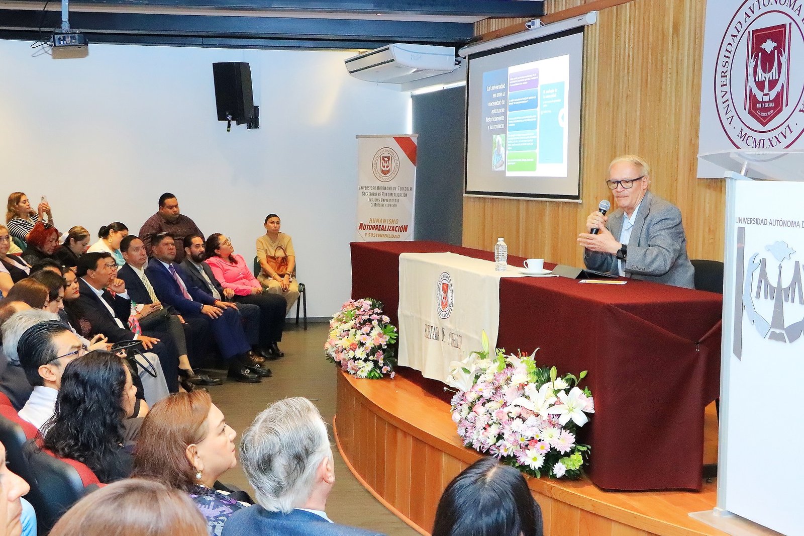 Ante la presencia de los 120 docentes que imparten las unidades de aprendizaje de Humanismo, Autorrealización y Sostenibilidad, así como Formación Cívica y Democrática, la Doctora Elvia Ortiz, Presidenta de la Academia Universitaria de Autorrealización y representante del Rector de la UATx, señaló que este único órgano colegiado se conformó hace más de una década y, sin duda, ha sido el parteaguas para el trabajo académico, además de tener una participación activa en el Modelo Humanista Integrador basado en Capacidades (MHIC).