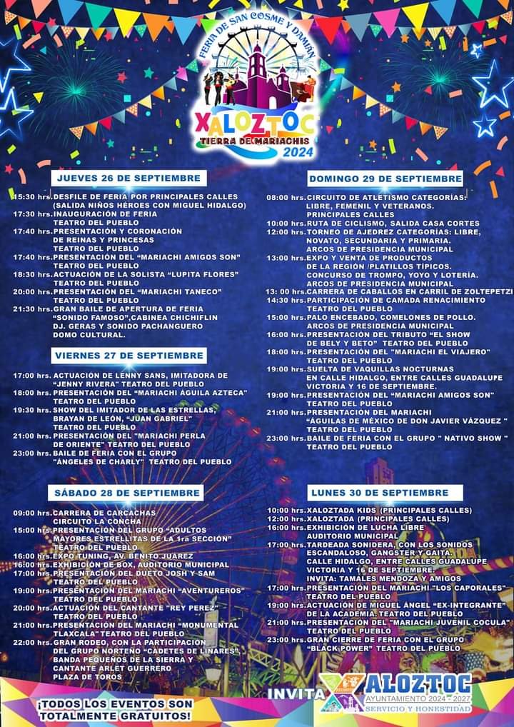 Tlaxcala, Tlax, a 25 de septiembre de 2024/JL Hertewing/ El gobierno municipal de Xaloztoc que encabeza el alcalde Elías Nava Sánchez, alista la tradicional feria “Xaloztoc 2024” Tierra del Mariachi, la cual se llevara a cabo del 26 al 30 de septiembre del año en curso, en su mensaje el edil señalo esta tradicional feria que se realiza en honor a los Santos San Cosme y Damián, damos a conocer nuestras tradiciones y costumbre como es el tradicional “mariachi”, nuestra gastronomía, nuestra cultura y nuestra historia y esto y mucho más nos hacen diferente a las demás ferias de esta región.