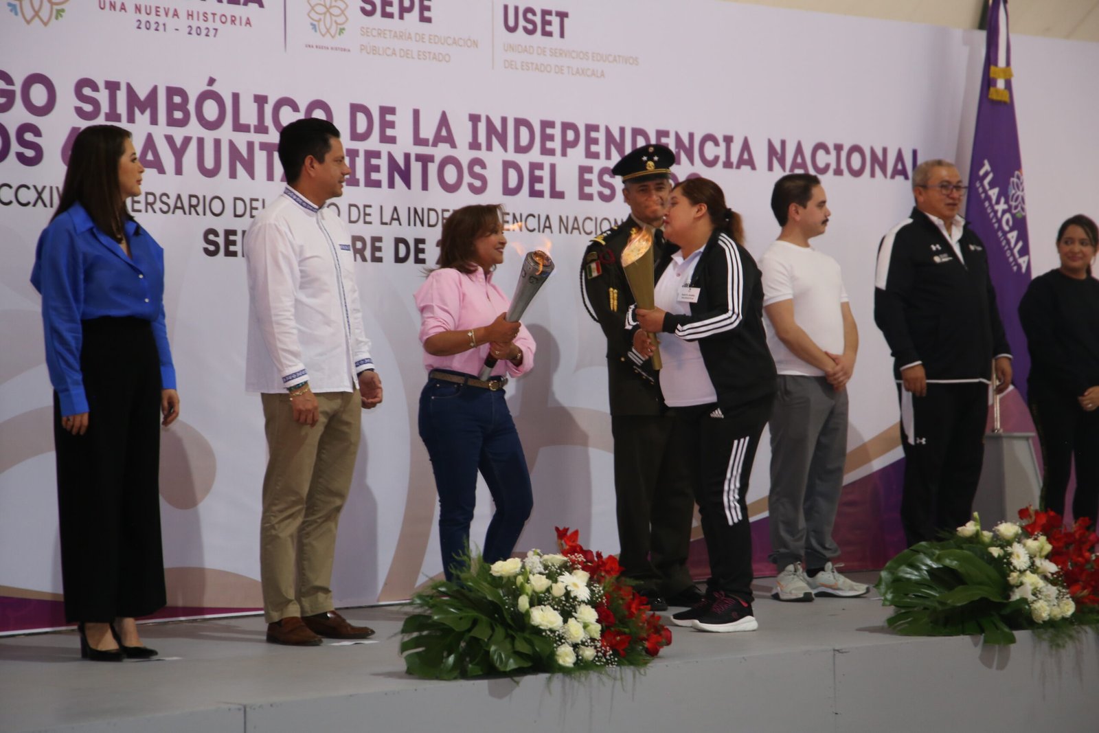 Tlaxcala, Tlax, a 15 de septiembre de 2024/JL Hertewing/ En el marco del CCXIV aniversario de la Independencia de México, la presidenta municipal de Santa Isabel Xiloxoxtla Yazmín Jiménez Rugerio, acudió la mañana de este domingo 15 de septiembre al domo blanco de la capital del estado a recibir el “Fuego Simbólico de la Independencia Nacional” de manos de la gobernadora del estado Lorena Cuéllar Cisneros, en su mensaje la edil señalo que este fuego simboliza la fuerza con la que lucharon hombres y mujeres para darnos Patria Y libertad.