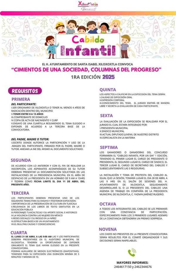Las y los interesados en formar parte de este 1er “cabildo Infantil” podrán ver la convocatoria en la pagina oficial del Ayuntamiento, así como en diferentes medios de comunicación digital, o pedir informes a los números 2464617150 o al 2462344676.
