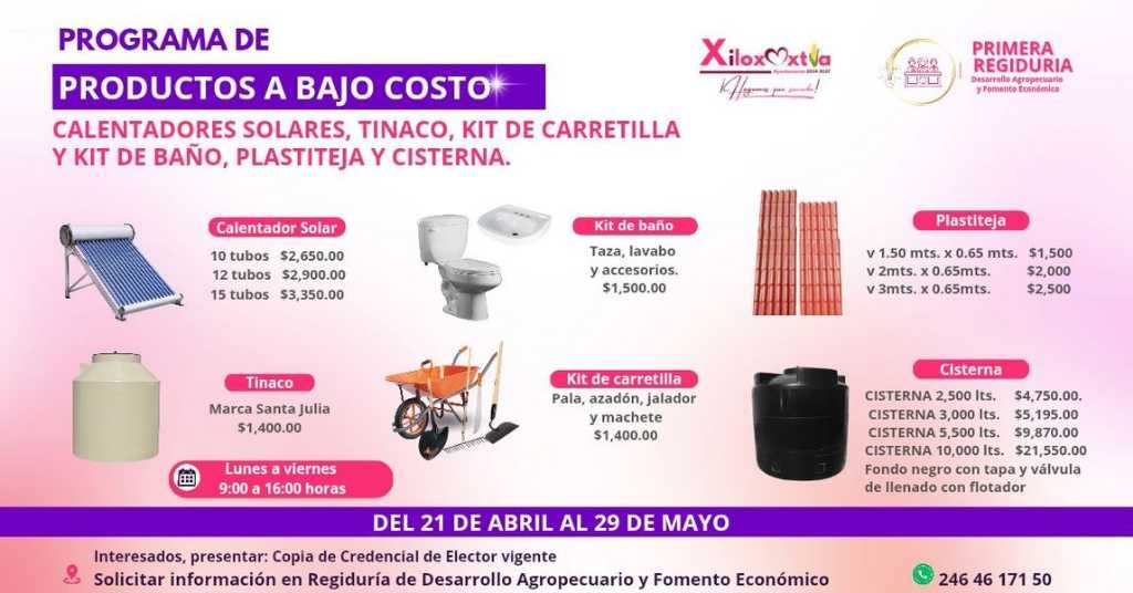 Tlaxcala, Tlax, 19 de abril de 2025/Redacción/ El gobierno municipal de Xiloxoxtla que encabeza la alcaldesa Yazmín Jiménez Rugerio, a través de la primera regidora María Guadalupe Pérez Sánchez dieron a conocer el programa de productos a bajo costo, donde las familias de escasos recursos podrán mejorar los servicios que son elementales en un hogar, como son calentadores solares, tinacos, kit de carretillas juego de baño, plastiteja y cisternas.