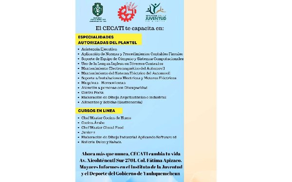 Tlaxcala, Tlax, a 21 de febrero del 2024/Redacción/ El gobierno municipal de Yauhquemehcan que encabeza, Marian Anita Chamorro Badillo, a través de la dirección de Juventud y Deporte invita a los habitantes de Yauhquemehcan a inscribirse a los cursos en línea y especialidades que ofrece el Centro de Capacitación para el Trabajo Industrial (CECATI), con el objetivo de fortalecer sus conocimientos y facilitar su inclusión a la vida laboral.