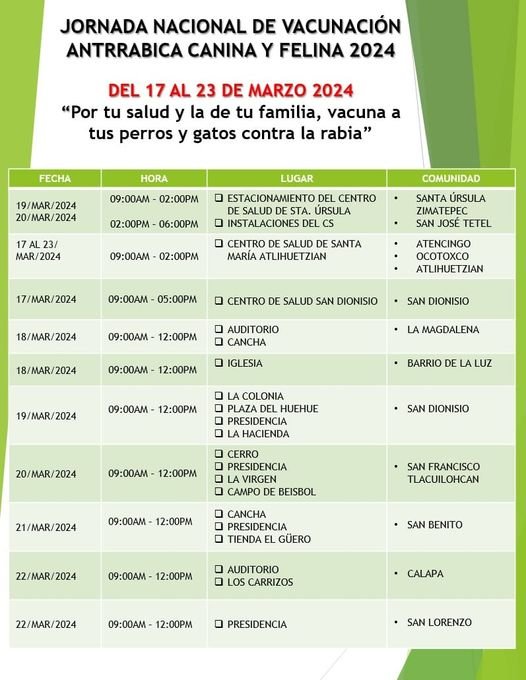 Las comunidades tienen asignado uno o dos días según su población, por lo que se invita a la ciudadanía que sea responsable con su mascota y que acuda a vacunarlos con esto prevenimos la rabia en humanos.